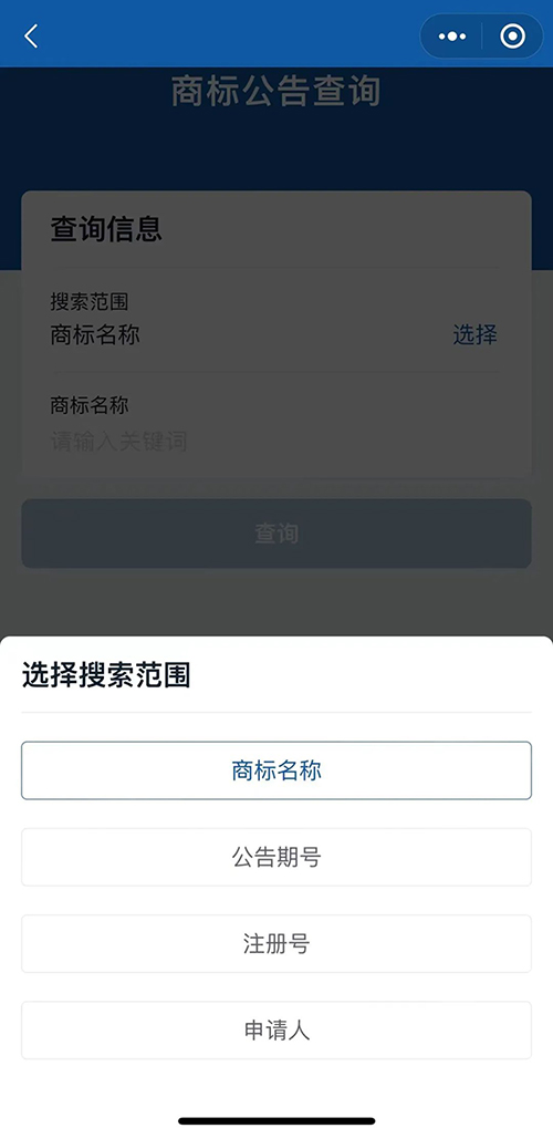 支持4种搜索范围查询:√ 商标名称√ 公告期号√ 注册号√ 申请人