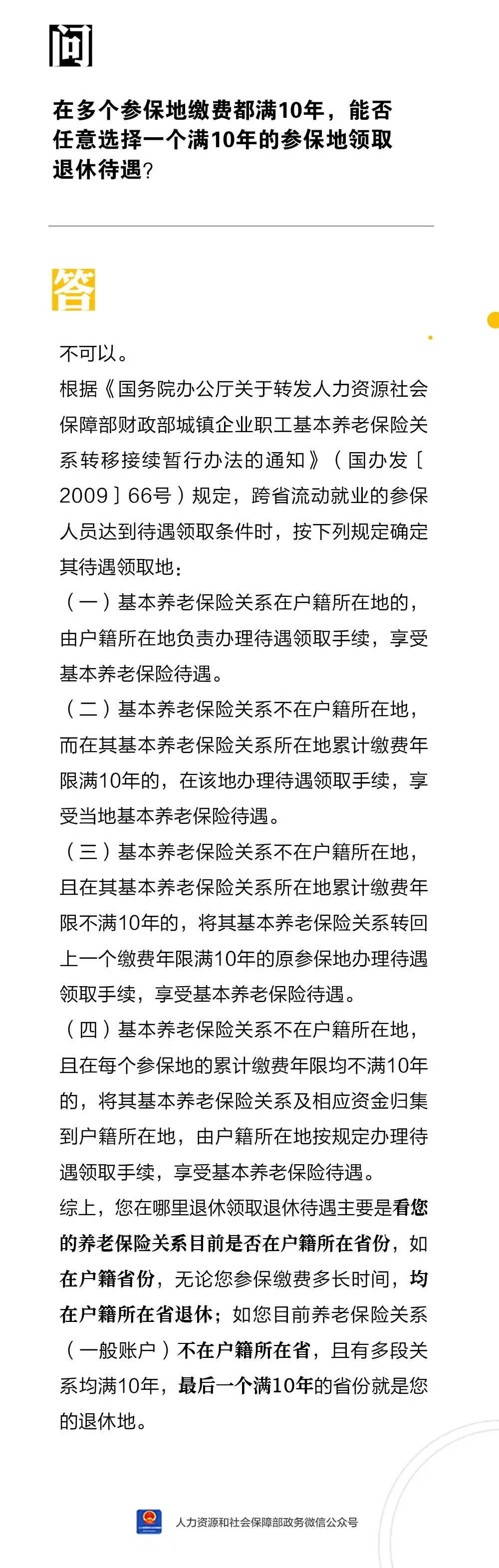 在多个参保地缴费都满10年,能否任意选择一个满10年的参保地领取退休待遇?