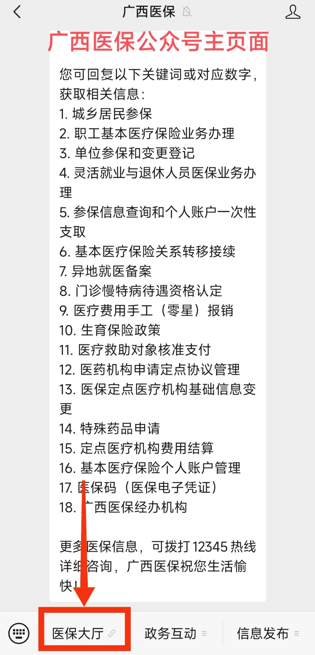 进入“桂医保”或“广西医保”公众号主页面,点击相应菜单栏进入医保服务大厅。