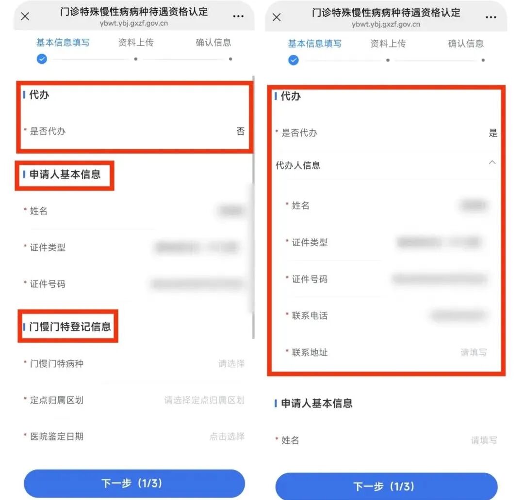 为他人办理,填写“代办人信息”、“申请人基本信息”和“门慢门特登记信息”,完成后点击“下一步”。