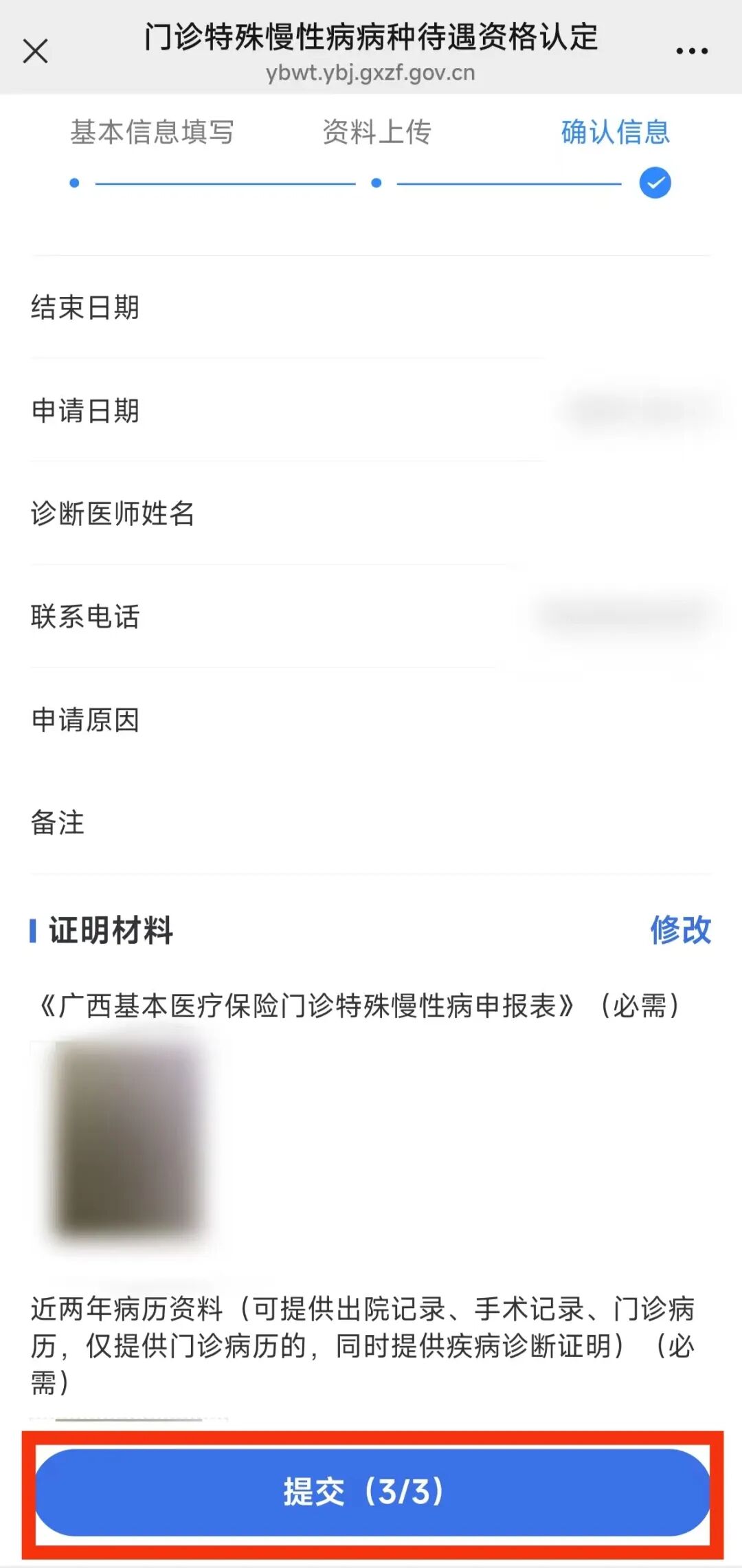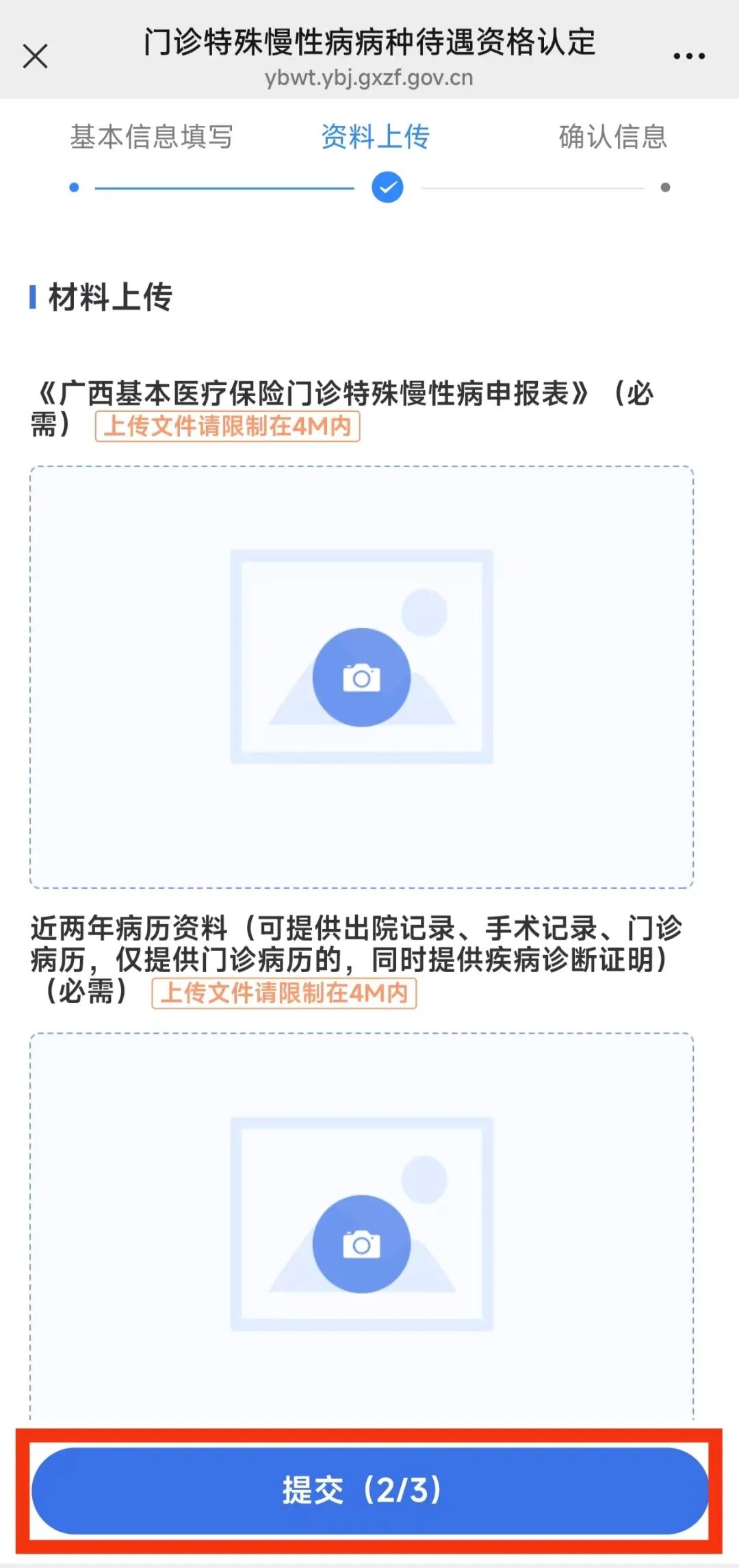 按要求上传《广西基本医疗保险门诊特殊慢性病申报表》、近两年病例资料等相关证明材料,然后点击“提交”。