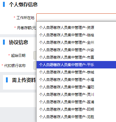 首先请选择您当前常住区县,如您的常住地在桂林市区,则选择“个人自愿缴存人员集中管理户-市直”即可