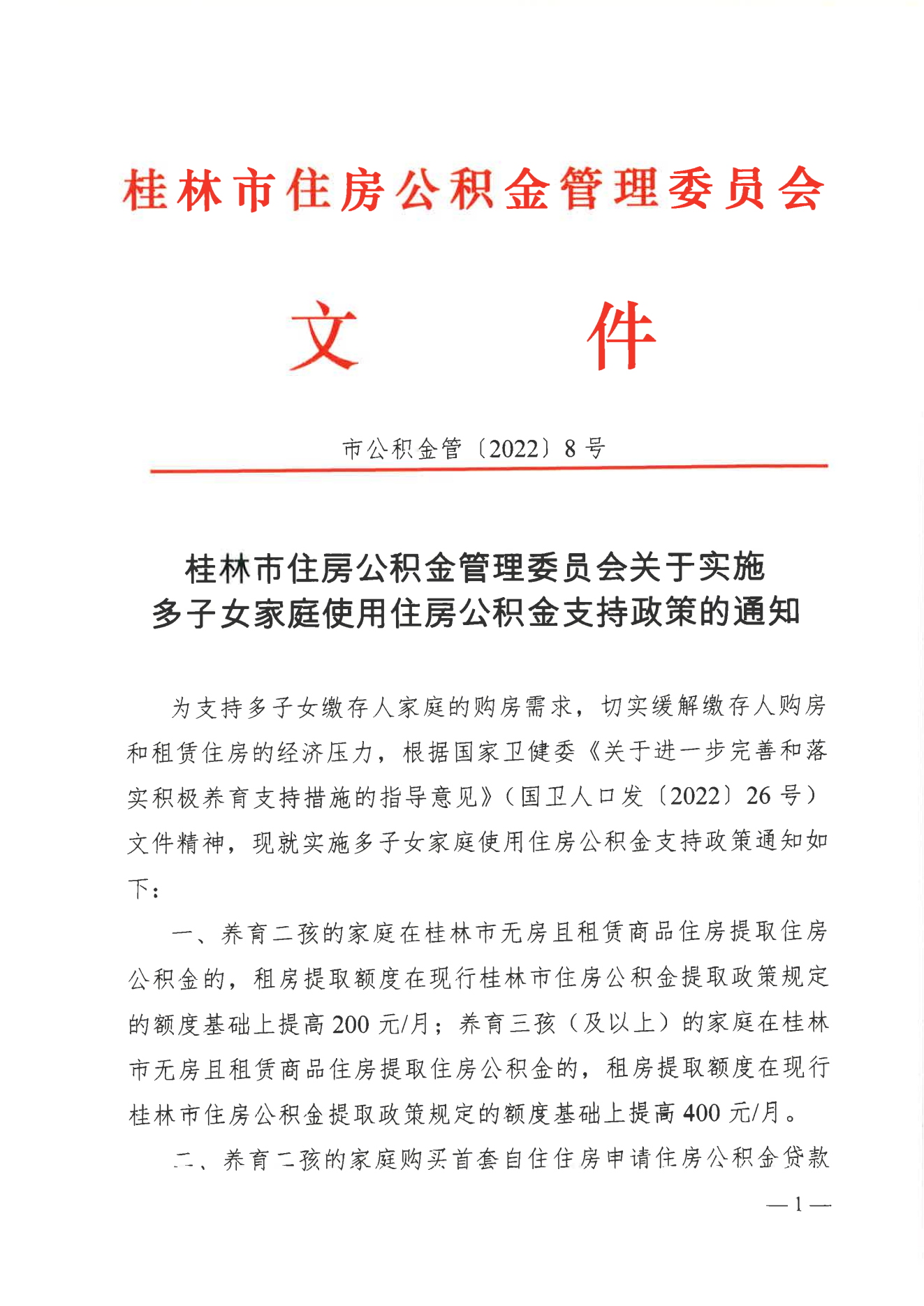 桂林市住房公积金管理委员会关于实施多子女家庭使用住房公积金支持政策的通知