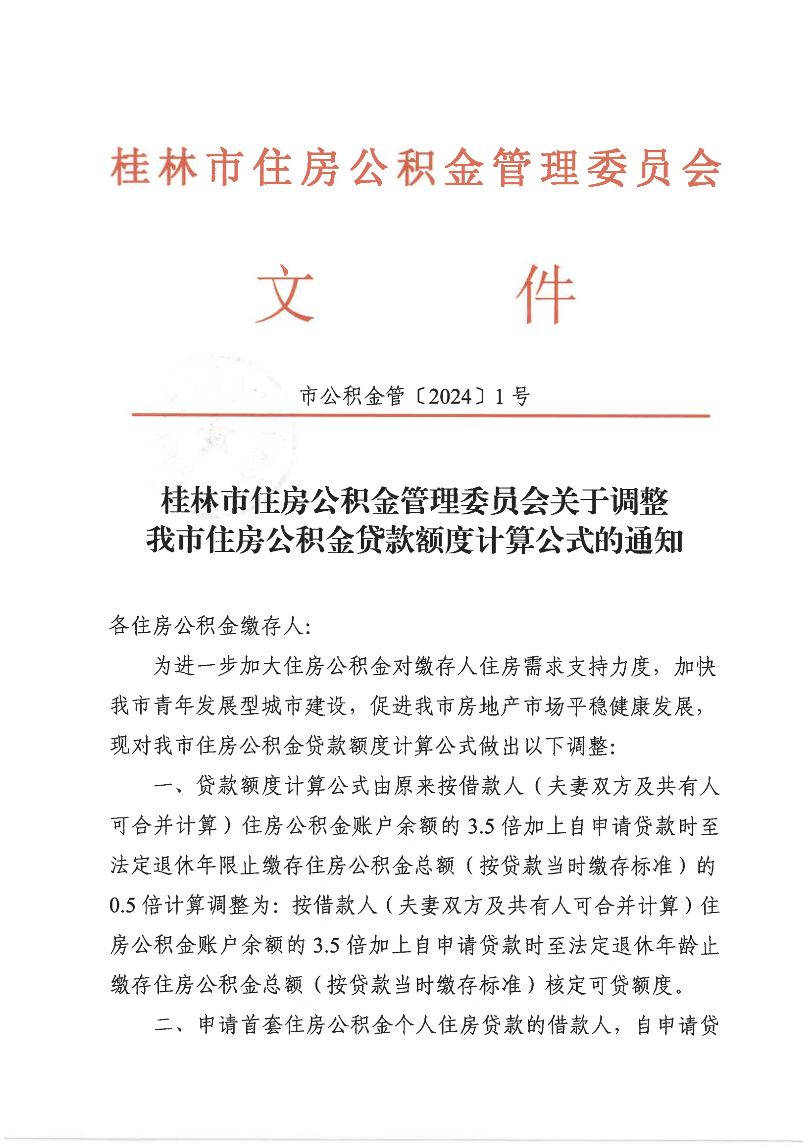 【政策】桂林市住房公积金管理委员会关于调整我市住房公积金贷款额度计算公式的通知(市公积金管〔2024〕1号)