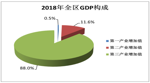 初步核算,全年地区生产总值(按可比价格计算)增长6.9%。其中,第一产业增加值下降11.0%;第二产业增加值增长4.6%;第三产业增加值增长7.3%。三次产业增加值占地区生产总值的比重分别为0.5%、11.6%、88.0%。按常住人口算,人均地区生产总值增长6.0%。