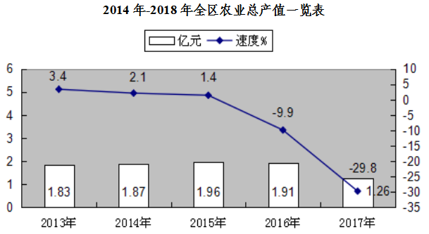 全年农林牧渔业总产值(按可比价格计算)比上年下降9.4%。其中,农业产值增长11.3%;牧业产值下降81.9%;渔业产值增长6.1%;农林牧渔服务业产值增长11.3%。