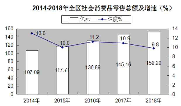 全年社会消费品零售总额152.29亿元,增长9.8%。其中,限额以上社会消费品零售总额36.52亿元,增长10.2%。