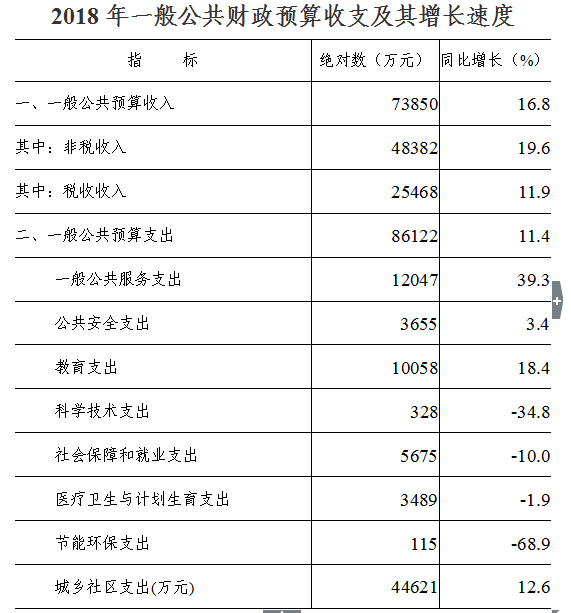 全年组织财政收入11.25亿元,比上年增长16.9%。其中,一般公共预算收入7.39亿元,增长16.8%;上划中央收入2.99亿元,增长16.7%,上划自治区分享“四税”收入0.87亿元,增长18.6%。在组织财政收入中,税收收入6.41亿元,增长15.0%。一般公共预算支出8.61亿元,增长11.4%。其中,一般公共服务支出12047万元,增长39.3%;公共安全支出3655万元,增长3.4%;教育支出10058万元,增长18.4%;科学技术支出328万元,下降34.8%;社会保障和就业支出5675万元,下降10.0%;医疗卫生与计划生育支出3489万元,下降1.9%;节能环保支出115万元,下降68.9%;城乡社区支出44621万元,增长12.6%。