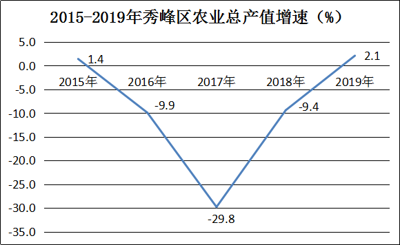 全年农林牧渔业总产值(按可比价格计算)比上年增长2.1%。其中,农业产值增长5.0%;牧业产值下降36.5%;渔业产值增长4.4%;农林牧渔服务业产值增长10.9%。