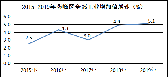 全年全部工业增加值按可比价计算,比上年增长5.1%。其中,规模以上工业增加值增长6.0%。规模以上工业分行业看,食品制造业增长11.1%;纺织业增长32.2%;造纸和纸制品业增长0.9%;医药制造业增长9.5%;橡胶和塑料制品业下降5.7%;通用设备制造业下降12.7%;计算机、通信和其他电子设备制造业增长51.8%;燃气生产和供应业增长17.8%。