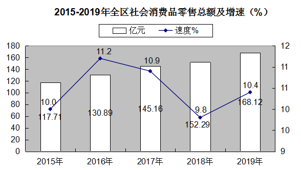 全年社会消费品零售总额168.12亿元,比上年增长10.4%。其中,限额以上社会消费品零售总额44.29亿元,增长16.4%。