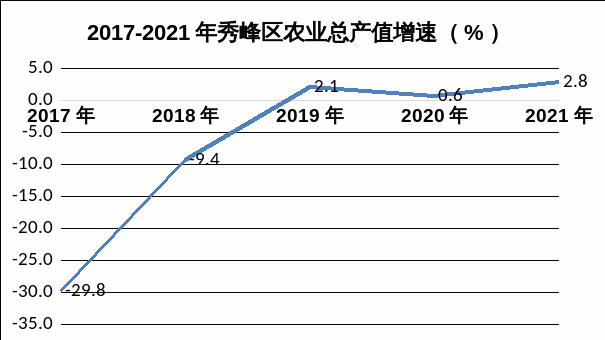 全年农林牧渔业总产值1.29亿元,按可比价格计算比上年增长2.8%。其中,农业产值0.9亿元,同比增长2.5%;畜牧业产值0.06亿元,同比增长0.2%;渔业产值0.16亿元,同比增长2.0%;农林牧渔服务业产值0.17亿元,同比增长5.9%。