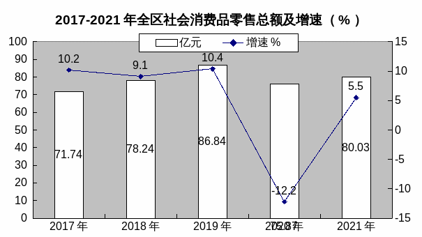 全年社会消费品零售总额80.03亿元,同比增长5.5%。其中,限额以上社会消费品零售总额39.65亿元,同比下降0.7%。
