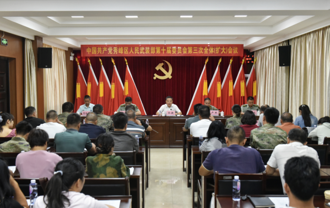8月12日,桂林市秀峰区人武部党委召开十届三次全体(扩大)会议,深入学习贯彻习近平强军思想,传达学习上级相关会议精神,总结部署有关工作。区委书记、区人武部党委第一书记余捷出席会议并讲话。区委常委、区人武部党委书记、上校政治委员卢寒主持会议并代表区人武部党委作工作报告,区人武部党委副书记、上校部长魏勇作工作部署。