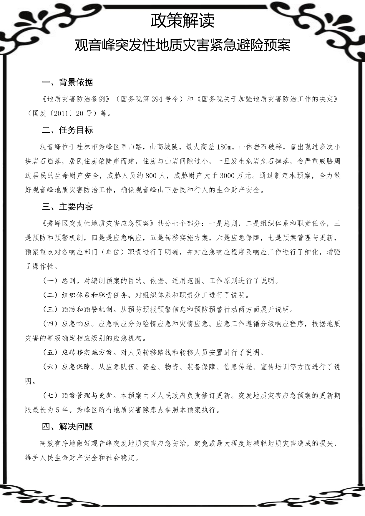 相关文件:桂林市秀峰区人民政府办公室关于印发观音峰突发性地质灾害紧急避险预案的通知秀政办〔2022〕3号