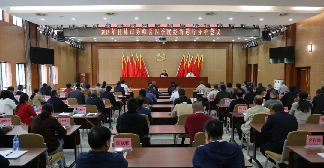 10月28日,桂林市秀峰区召开2025年四季度经济运行分析会议,深入贯彻落实党的二十届四中全会精神和自治区、桂林市四季度经济工作会议精神,全面复盘前三季度经济工作,分析研判形势、找准问题困难、明确发展措施,以“倒计时”状态全力冲刺四季度经济工作,努力完成全年目标任务,为“十四五”圆满收官奠定基础。区长刘丰华出席会议并讲话。区人大常委会主任提名人选陈建国、区政协主席苏绍坤出席会议。区委副书记周琥主持会议。