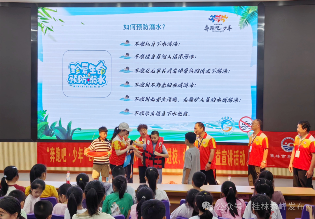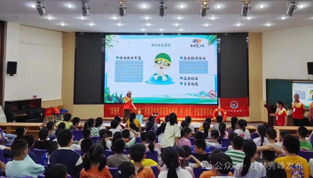 为切实筑牢青少年防溺水安全防线,有效预防溺水事故发生,5月16日,由广西壮族自治区体育局、教育厅、共青团广西区委、妇女联合会联合主办,广西水上运动发展中心、广西游泳协会、广西体育人力资源开发和保障中心、桂林市冬泳协会共同承办的“2025年广西防溺水和游泳安全进校园公益宣讲活动”在桂林市中华小学举行。