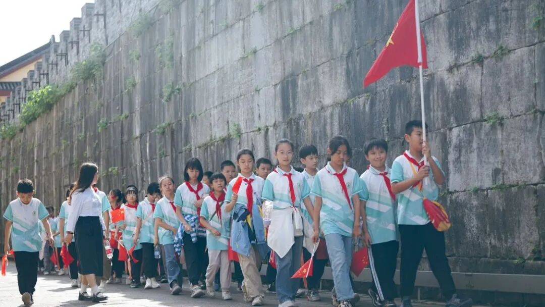 活动中,学生们肩扛队旗、手持国旗,和老师们沿古城墙健步前行,沿途参观抗战遗址,并走进最近热播的电视剧《阵地》实景拍摄地,了解桂林抗战历史,接受爱国主义教育。