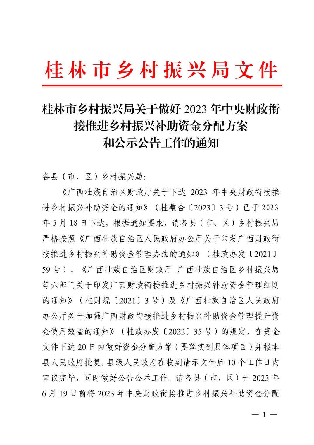 桂林市乡村振兴局关于做好2023年中央财政衔接推进乡村振兴补助资金分配方案和公示公告工作的通知