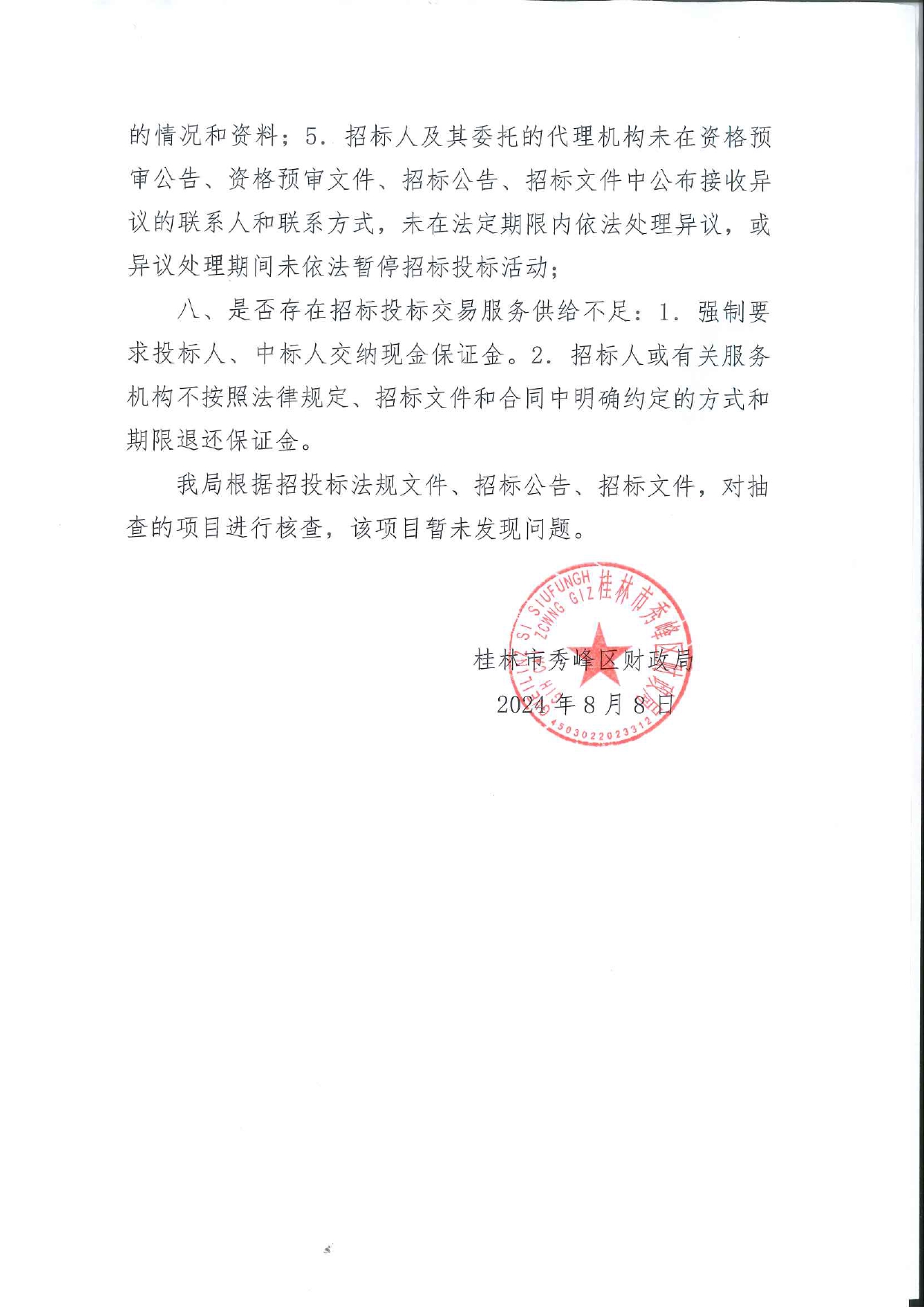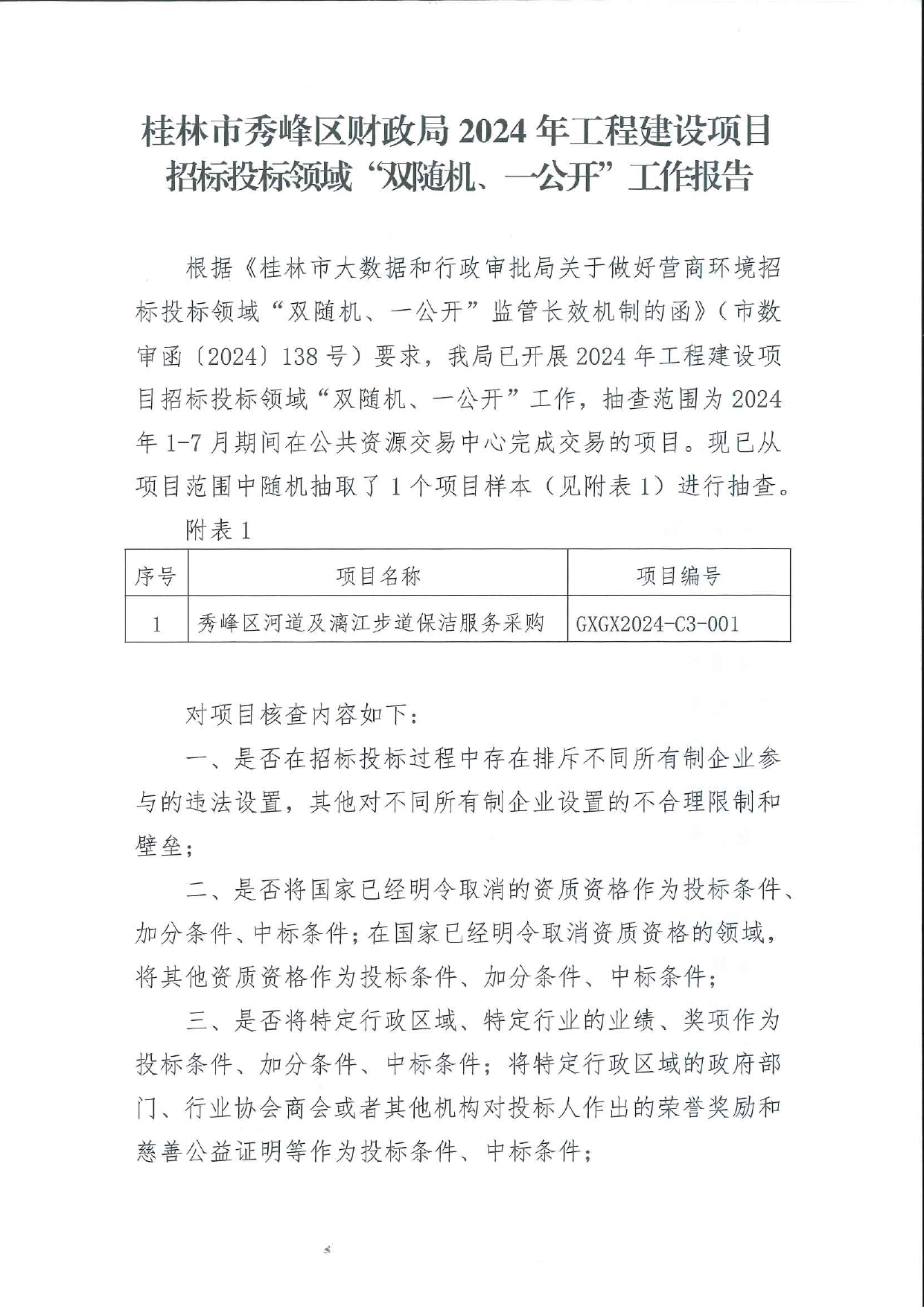 桂林市秀峰区财政局2024年工程建设项目招标投标领域“双随机、一公开”工作报告