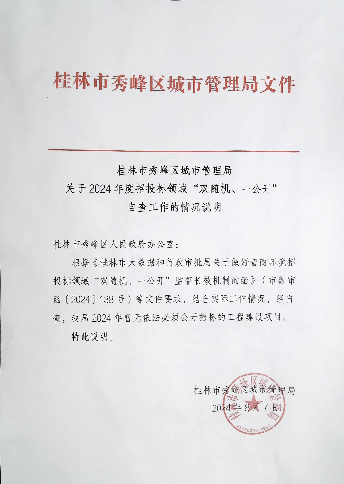 桂林市秀峰区城市管理局关于2024年度招标投标领域“双随机、一公开”自查工作的情况说明