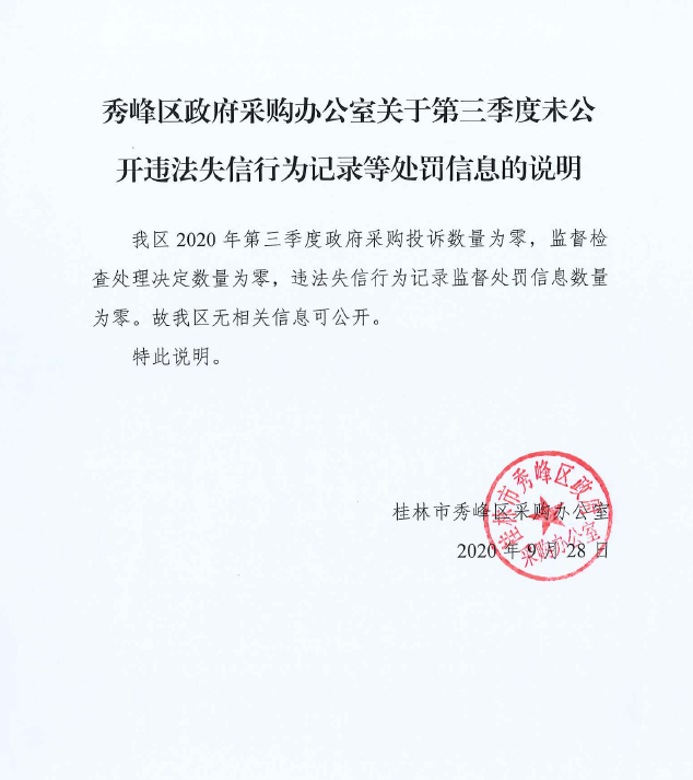 秀峰区政府采购办公室关于第三季度未公开违法失信行为记录等处罚信息的说明