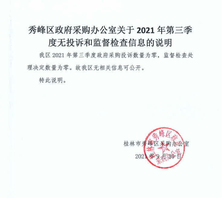 秀峰区政府采购办公室关于2021年第三季度无投诉和监督检查信息的说明