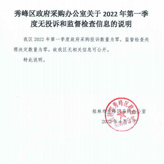 秀峰区政府采购办公室关于2022年第一季度无投诉和监督检查信息的说明