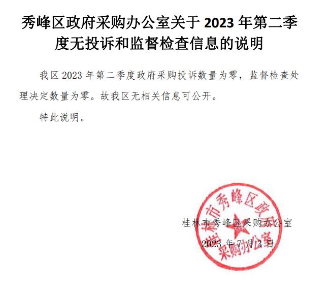 秀峰区政府采购办公室关于2023年第二季度无投诉和监督检查信息的说明