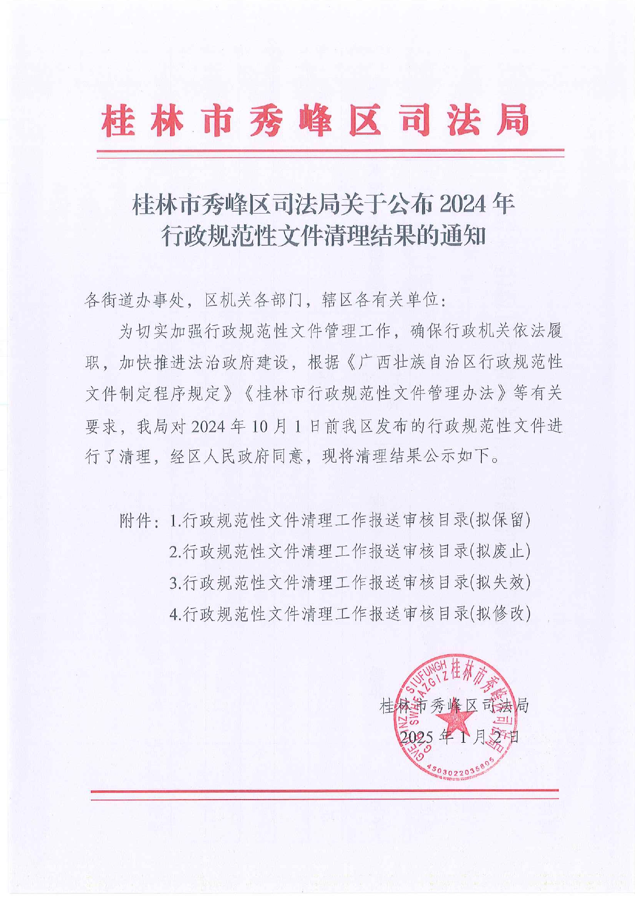 桂林市秀峰区司法局关于公布2024年行政规范性文件清理结果的通知