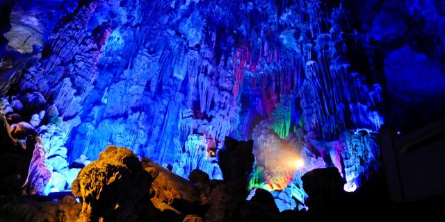 桂林芦笛景区位于桂林市西北的桃花江畔,距市中心6公里,是一个以游览岩洞为主、观赏山水田园风光为辅的风景名胜区,是整个漓江风景名胜区的重要组成部分,也是1982年11月国务院颁布的第一批国家重点风景名胜区。芦笛岩于1959年发现,1962年开放。传说因为在岩洞周围长有一种可以做芦笛的芦笛草,所以称之为芦笛岩。芦笛岩整个岩洞犹如一座用宝石、珊瑚、翡翠雕砌而成的宏伟、壮丽的地下宫殿。这些千姿百态的钟乳石是由于地下水的作用,溶解岩石中的碳酸钙,经过上百万年的沉淀结晶堆积而成的。因此,芦笛岩被人们誉为“大自然艺术之宫”,拥有大自然赋予桂林山水清奇俊秀的岩溶风貌。