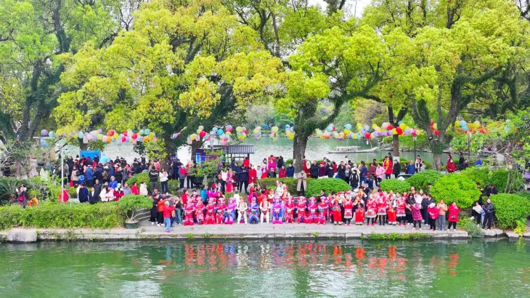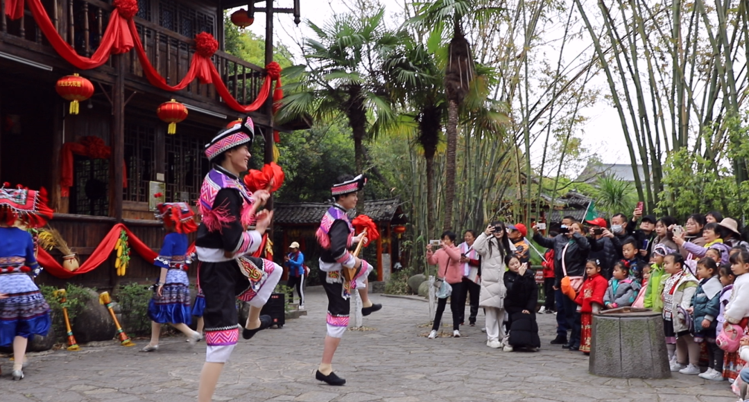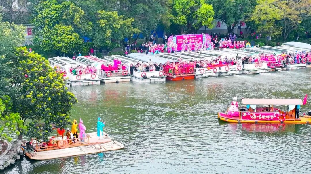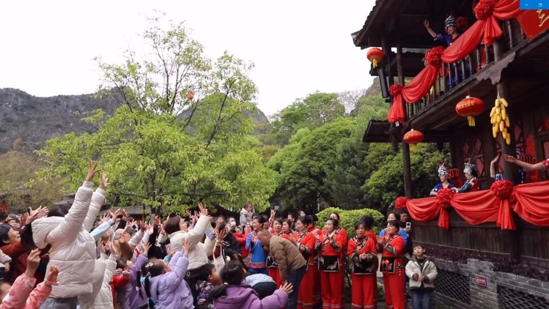 在刘三姐大观园景区,刘三姐与阿牛哥乘着竹排翩然而至,悠扬的歌声荡漾在水畔。三姐绣楼下,一场别开生面的山歌擂台赛火热上演,刘三姐与游客“秀才”们即兴对歌,你来我往,妙语连珠,引得现场掌声不断。除了精彩的山歌比拼,景区还设置了趣味十足的抛绣球环节,游客们争相抢夺,将吉祥与祝福带回家。此外,游客们还能沉浸式体验瑶族“爬楼求爱”、跳多耶团结舞等特色民俗活动,零距离感受浓郁的民族风情与热情好客。