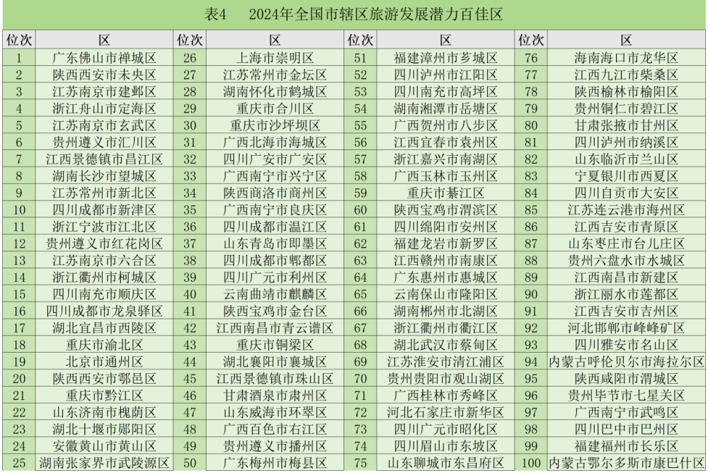据了解,城市旅游发展潜力是指作为旅游目的地的城市在旅游资源、旅游市场、社会经济支撑条件等诸因素的综合作用下,在与其他城市的竞争中所体现出来的潜在的、能够发挥出来并能促进旅游产业持续发展的能力,是城市旅游业生命得以延续的关键因素。旅游发展潜力评价是一个对城市旅游业系统的分析和总结。旅游发展潜力指标体系包含旅游资源潜力、旅游市场潜力、旅游开发效益、旅游支撑条件4个方面,共21个指标。得分靠前的100个区即为2024年全国市辖区旅游发展潜力百佳区。