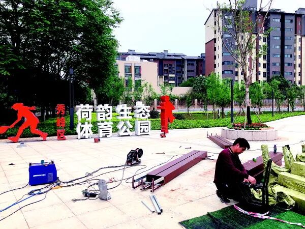 工作人员在完善体育公园的设施。