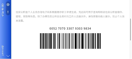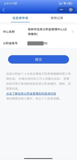 缴存职工登录“全国住房公积金”微信小程序,选择“服务—业务办理电子码—信息表申请”,点击提交按钮申请电子码,提交后即可显示电子码,轻触条形码即可显示电子码数字编号,向公积金中心工作人员出示即可。(电子码申请当天24点自动失效,电子码被查询后即失效。)