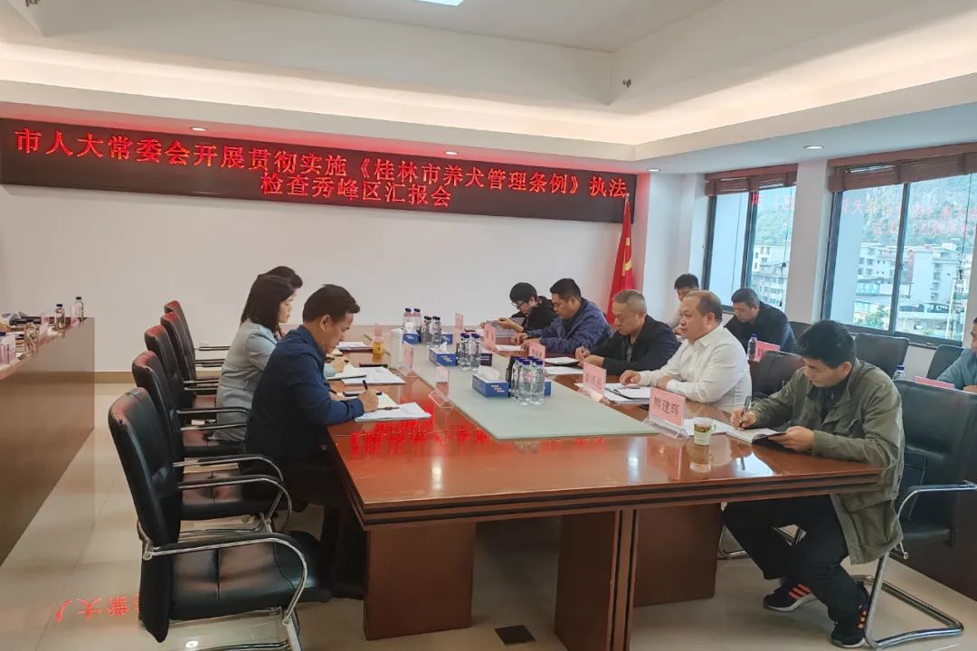 执法检查组听取了秀峰区人民政府及其有关部门、各街道办事处、市公安局秀峰分局等单位关于《桂林市养犬管理条例》贯彻实施情况汇报,并与部分市、区人大代表、社区(村委)代表、居民(村民)群众代表、业主委员会和物业服务企业代表,就如何进一步加强贯彻实施《桂林市养犬管理条例》开展了座谈交流。