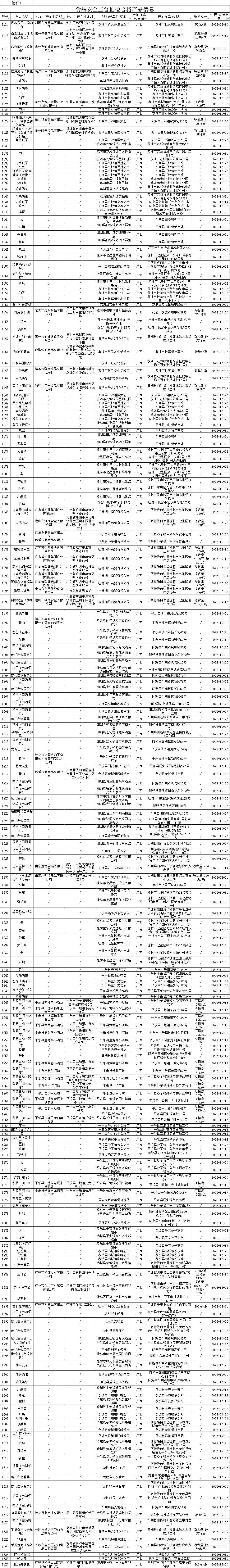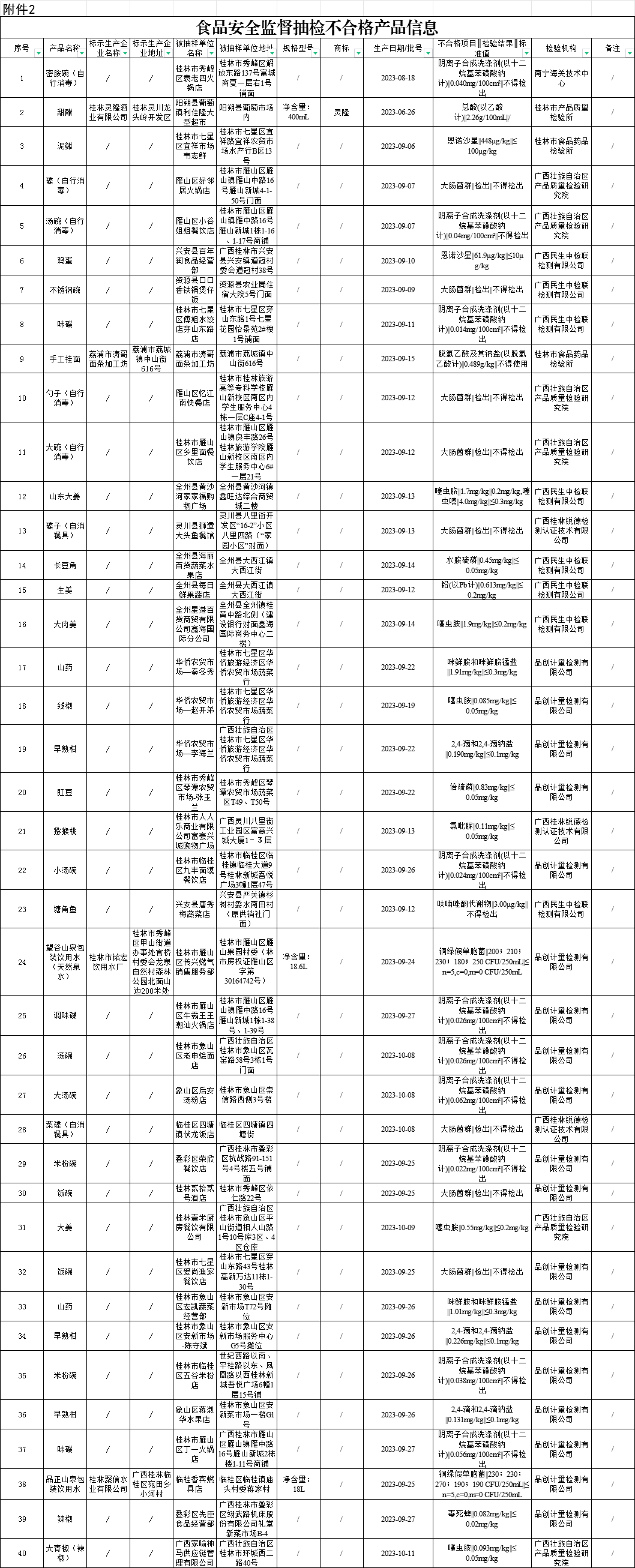 近期,桂林市市场监督管理局组织抽取食用油、油脂及其制品、酒类、食用农产品、餐饮食品、罐头、蔬菜制品、茶叶及相关制品、粮食加工品、薯类和膨化食品、食品添加剂、冷冻饮品、调味品、水果制品、肉制品、炒货食品及坚果制品、速冻食品、其他食品、豆制品、可可及焙烤咖啡产品、蛋制品、方便食品、乳制品、食糖、淀粉及淀粉制品、蜂产品、糖果制品、饼干、糕点、水产制品等29大类食1366批次样品。根据食品安全国家标准检验和判定,检出农药残留、兽药残留、重金属、微生物、食品添加剂、其它指标不合格样品40批次(见附件2)。具体情况通告如下: