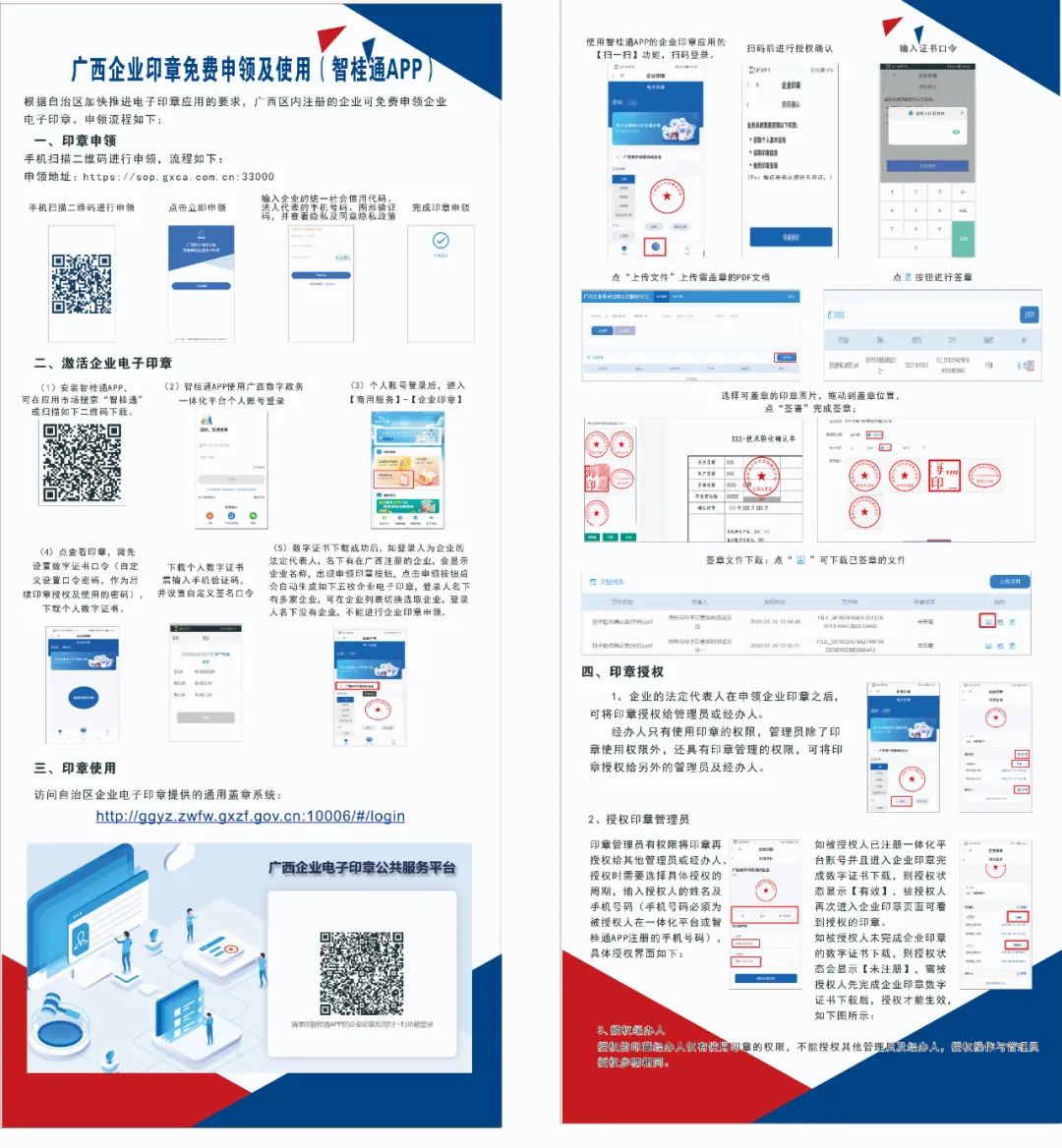 A:广西全区统一企业电子印章公共服务平台是自治区统一建设的平台,给广西区内注册的企业免费发放包括:公章、合同章、财务章、税务章、法人章等5枚电子印章。
