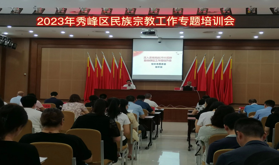 为推动秀峰区民族宗教工作高质量发展,巩固提升秀峰区全国民族团结进步示范区建设成果,7月5日上午,秀峰区组织召开2023年民族宗教工作专题培训会。区四家班子领导、区委统一战线工作领导小组成员单位主要负责人、各村(社区)主要负责人共80余人参加此次培训。