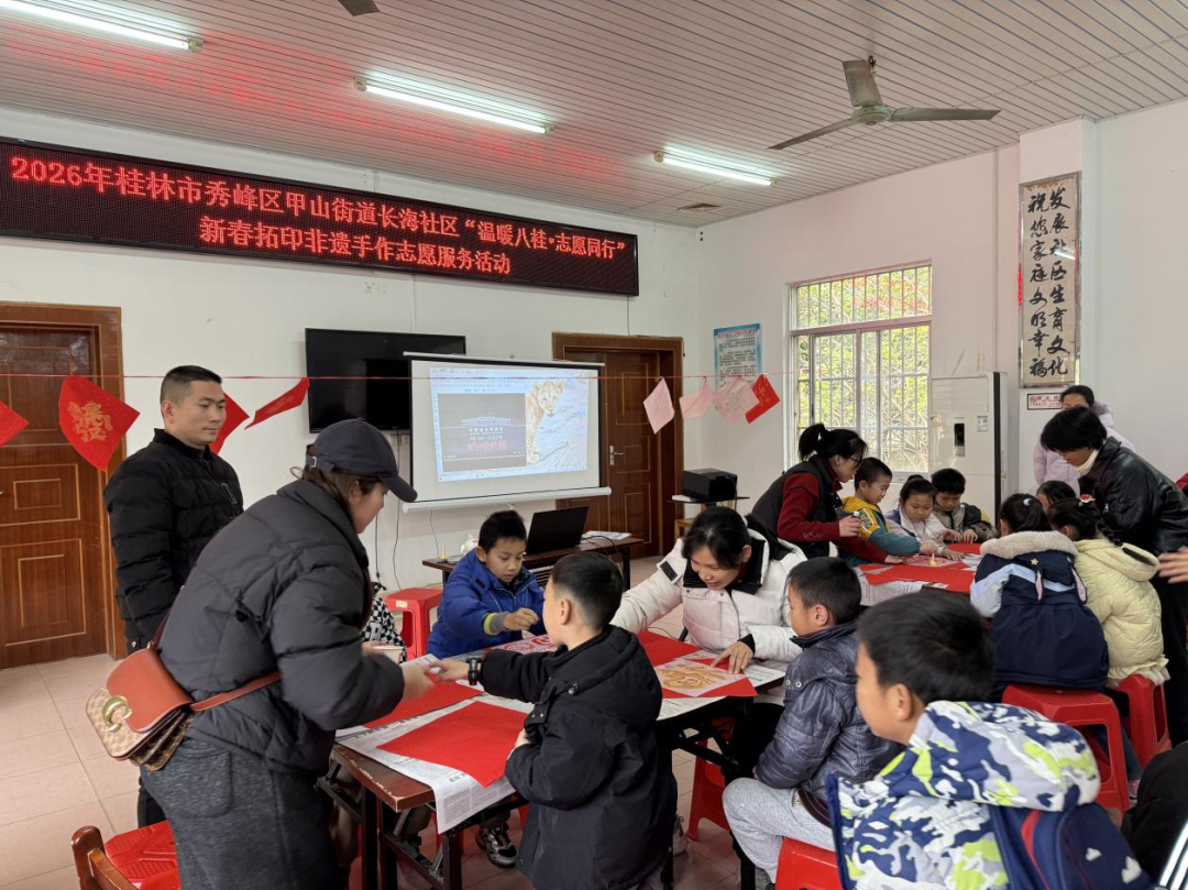 2月6日,甲山街道长海社区开展“温暖八桂,志愿同行”新春拓印非遗手作志愿服务活动。图为志愿者老师生动讲解非遗拓印的历史渊源与制作技巧。该活动弘扬了中华优秀传统文化,也丰富社区青少年的寒假生活。