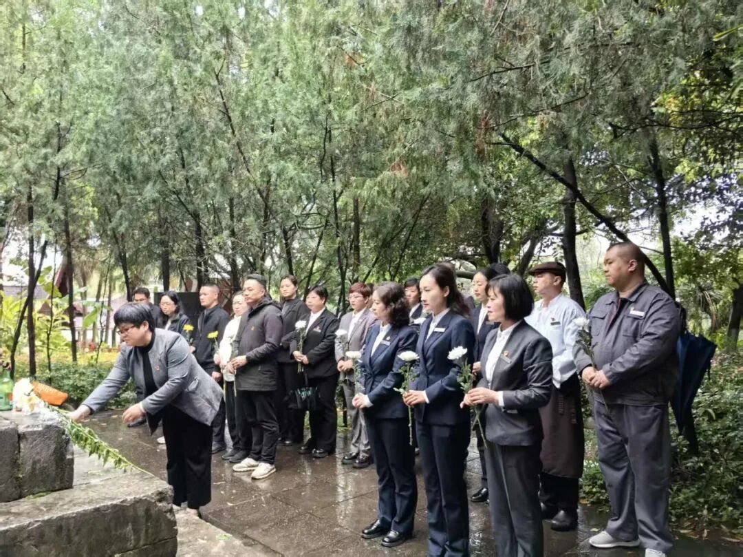 在松柏掩映的陈光烈士纪念塔前,全体人员整齐列队,向烈士行鞠躬礼、肃立默哀,缅怀其为民族解放事业献身的崇高精神。随后,全体党员面向党旗重温入党誓词,铿锵誓言回荡现场。大家依次敬献鲜花,以绿色文明方式寄托追思。